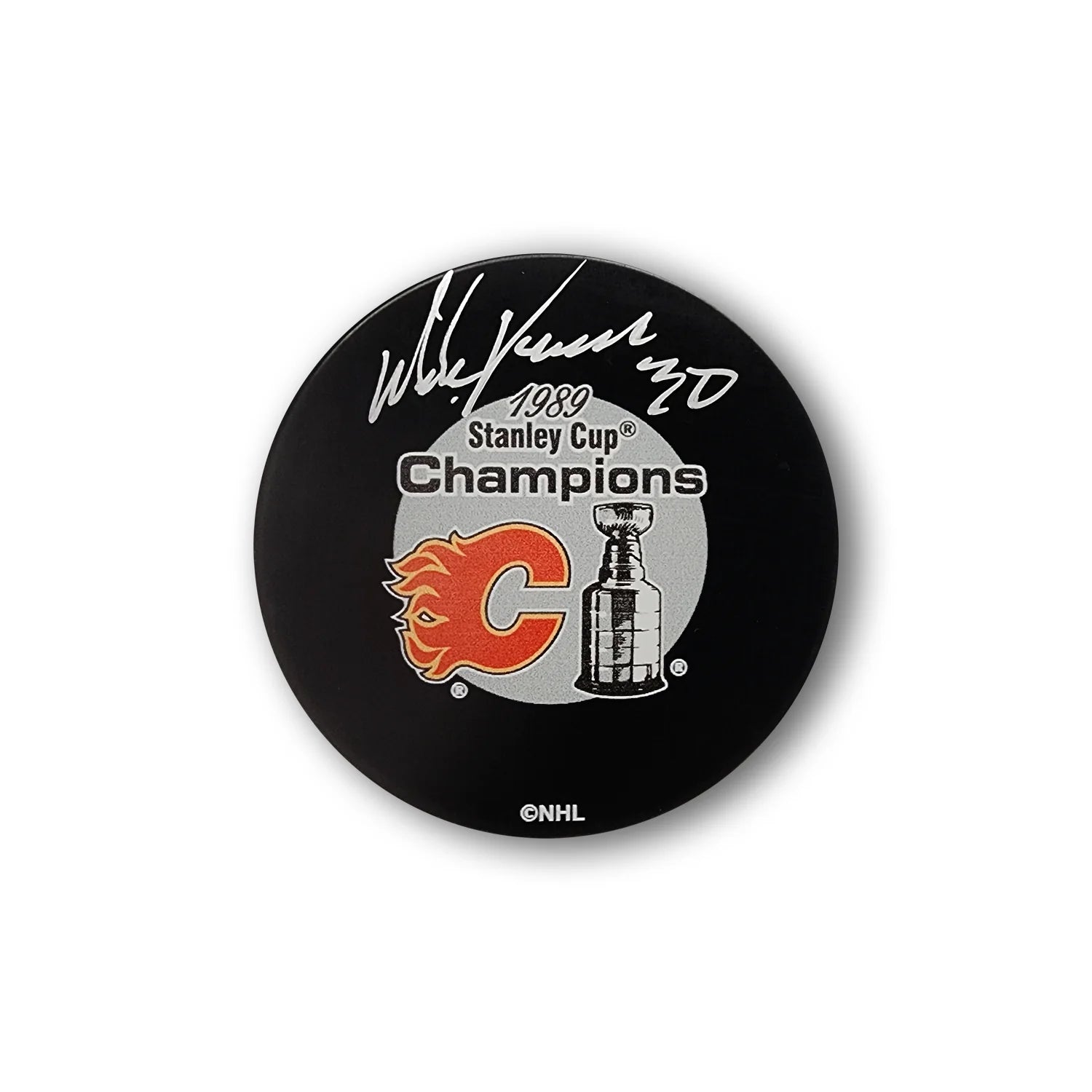 Mike Vernon Autographed 1989 Stanley Cup Calgary Flames Hockey Puck