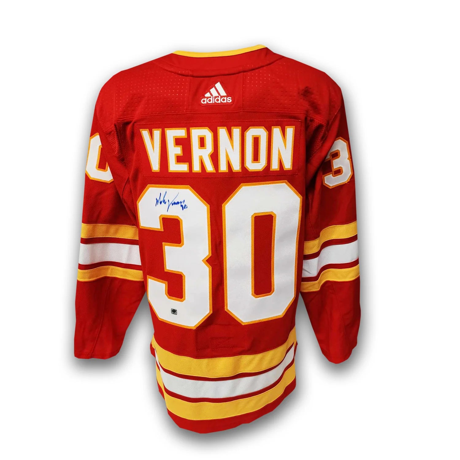 This Calgary Flames Adidas Jersey has been autographed by Mike Vernon