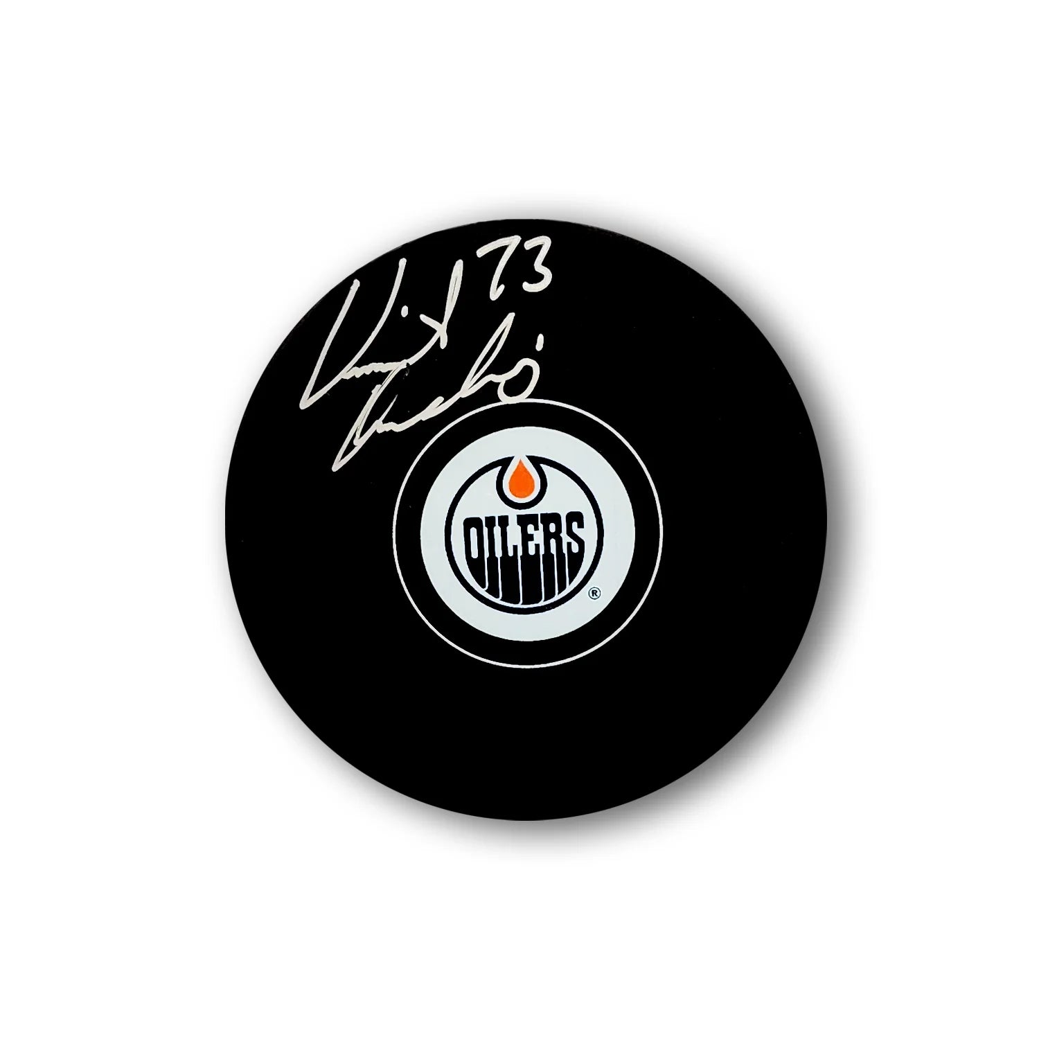 This Edmonton Oilers Hockey Puck has been autographed by Vincent Desharnais